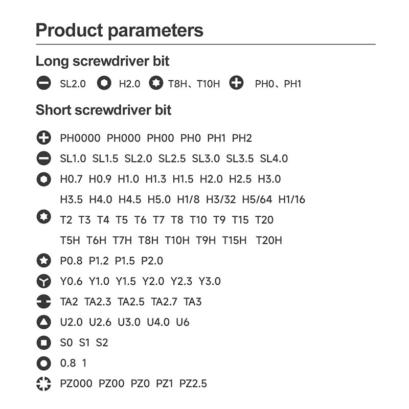 • Bits: The kit comes with high-quality, durable bits that cover screws of mainstream devices. Each bit is crafted for accuracy and long-lasting use, ensuring smooth operation and minimal wear.